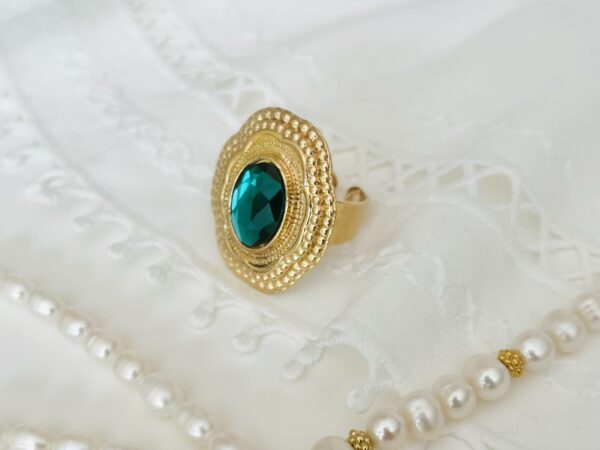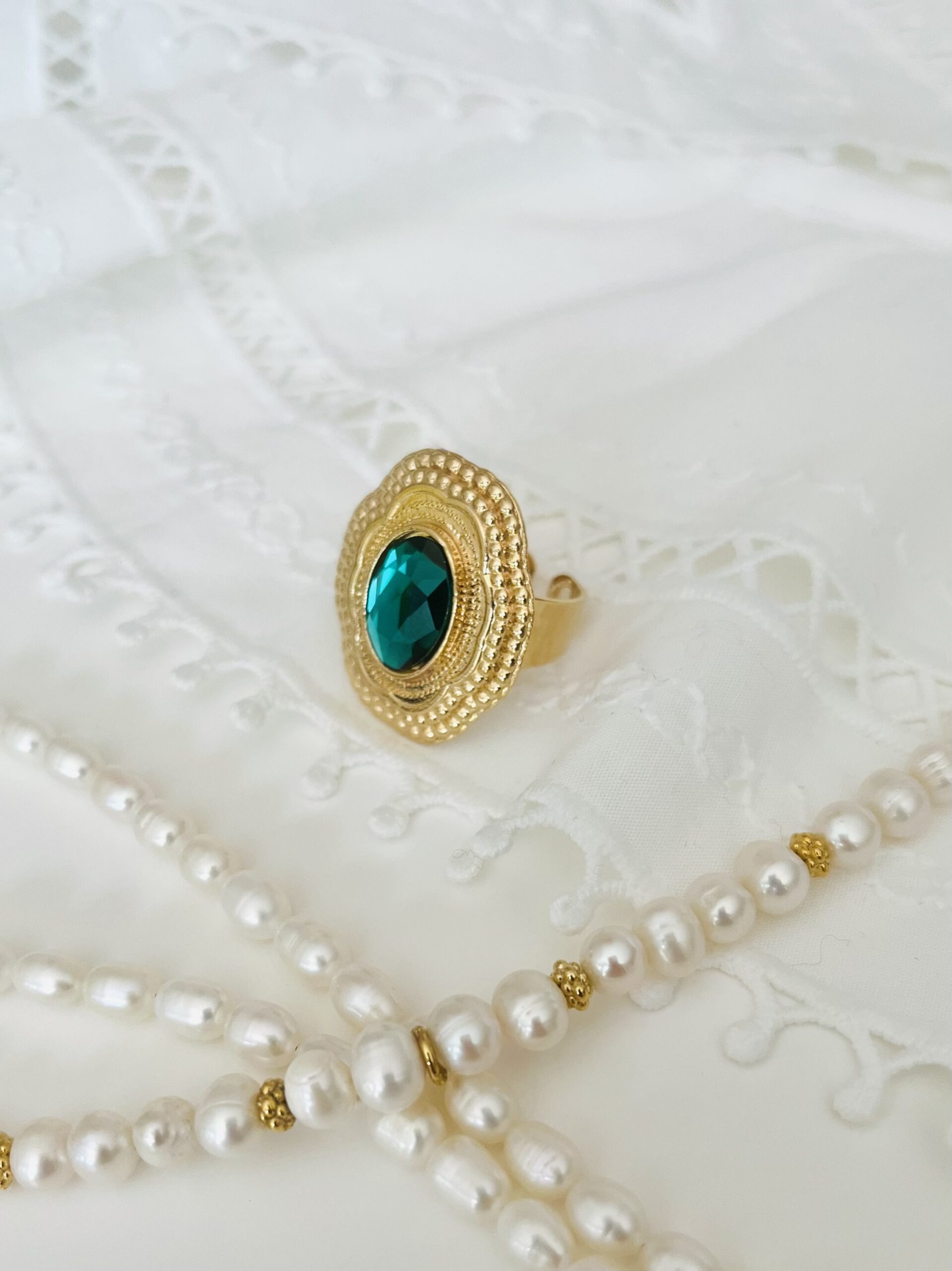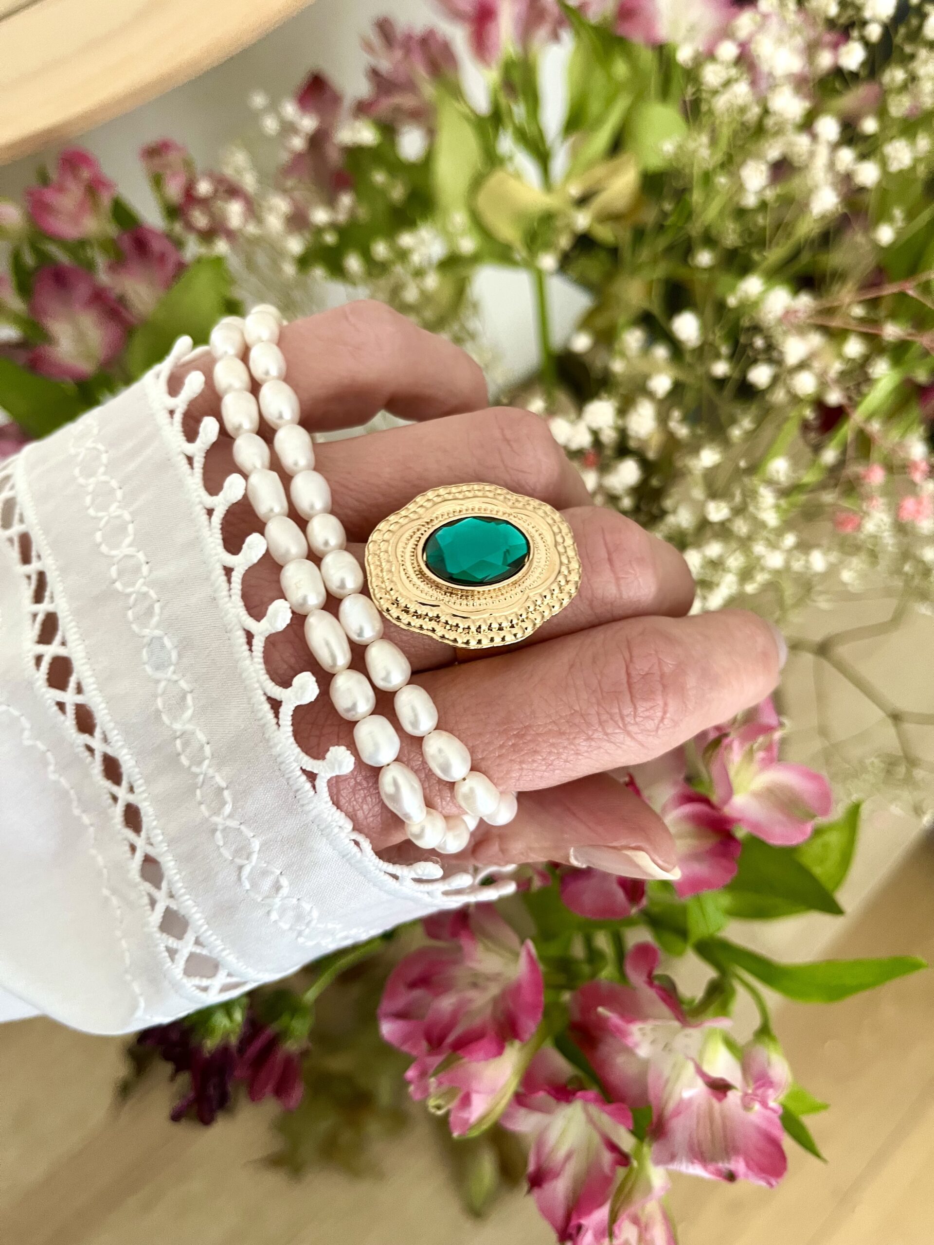 Bague élégante et raffinée perles cristal vert émeraude & plaqué or