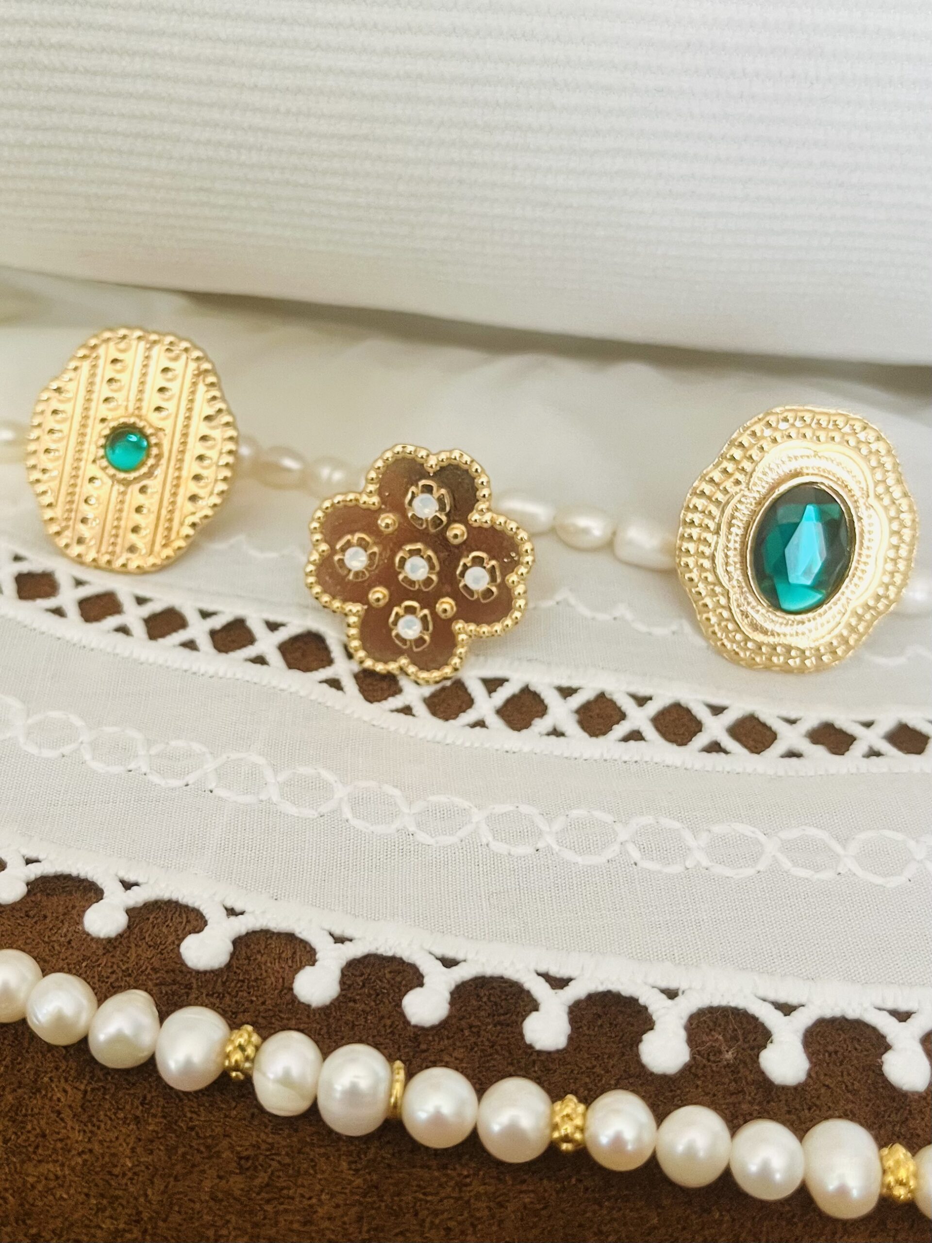 Le plaqué or apporte une touche de luxe, tandis que sa pierre ovale facettée ajoute une note de couleur et de brillance, mettant en valeur la beauté de chaque détail.