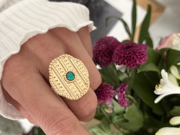 Découvrez cette magnifique bague en plaqué or, ornée d’une perle en cristal d’un vert émeraude éclatant.