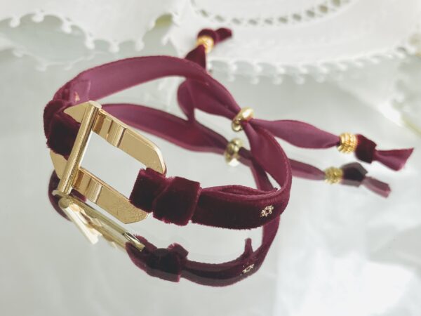 Ce bracelet délicat associe la douceur du velours à l’éclat d’une estampe rectangulaire dorée à l’or fin.