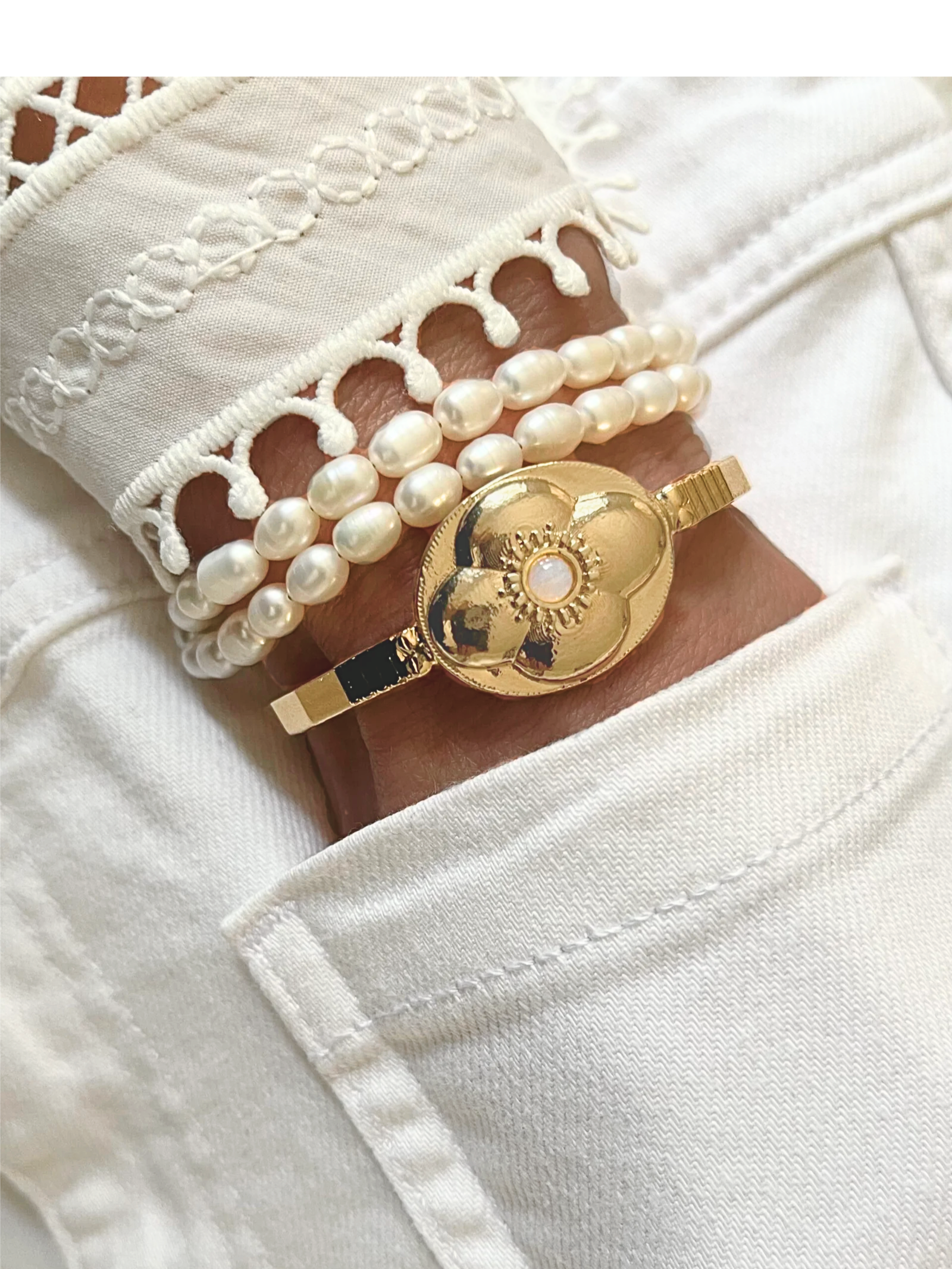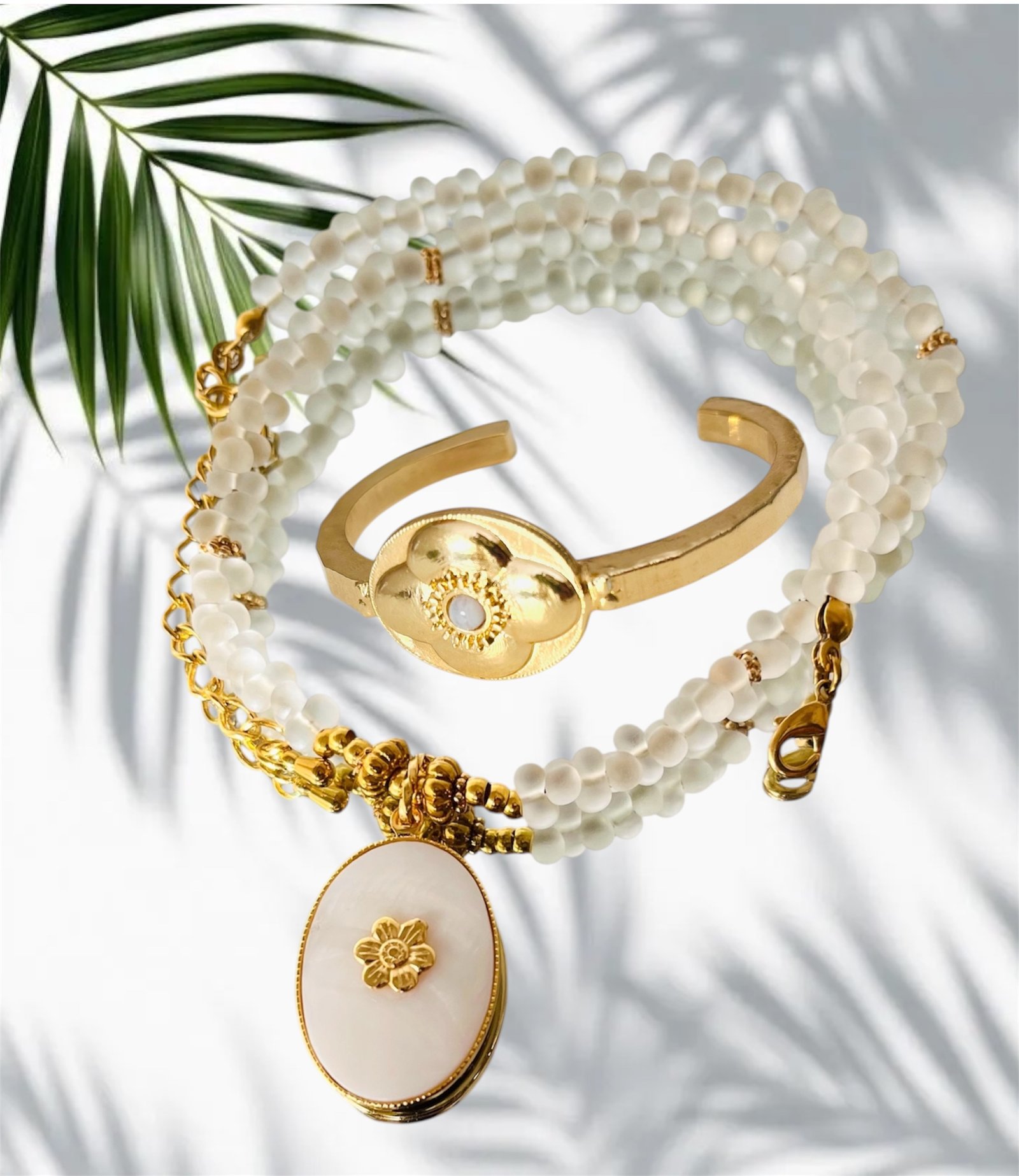 Notre bracelet doré est présenté avec un bracelet en nacre naturelle > Bracelet perles