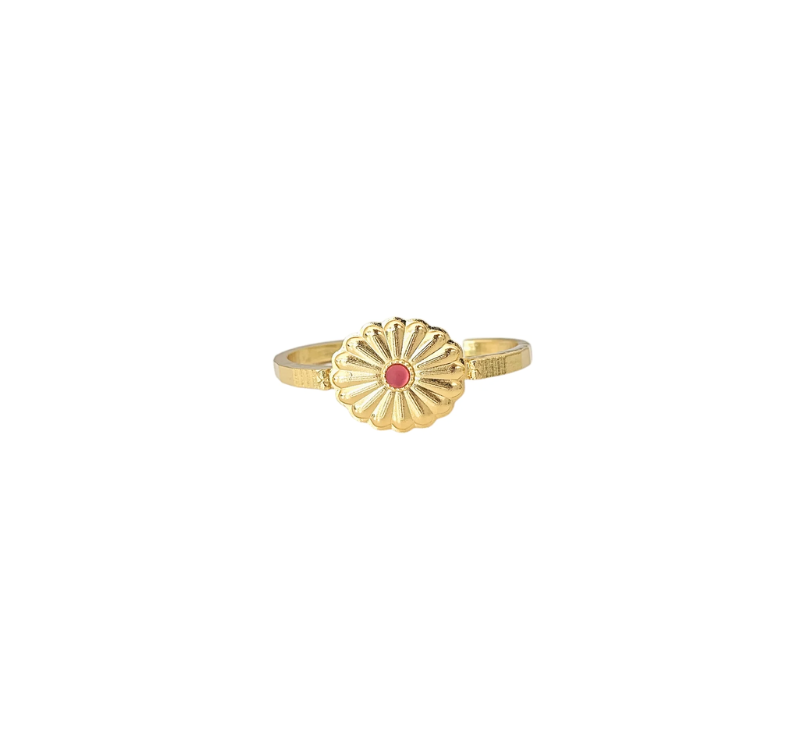 La fleur est délicatement ornée d’une pierre framboise, qui ajoute une note de couleur et de brillance, faisant de ce bracelet un accessoire unique et raffiné.