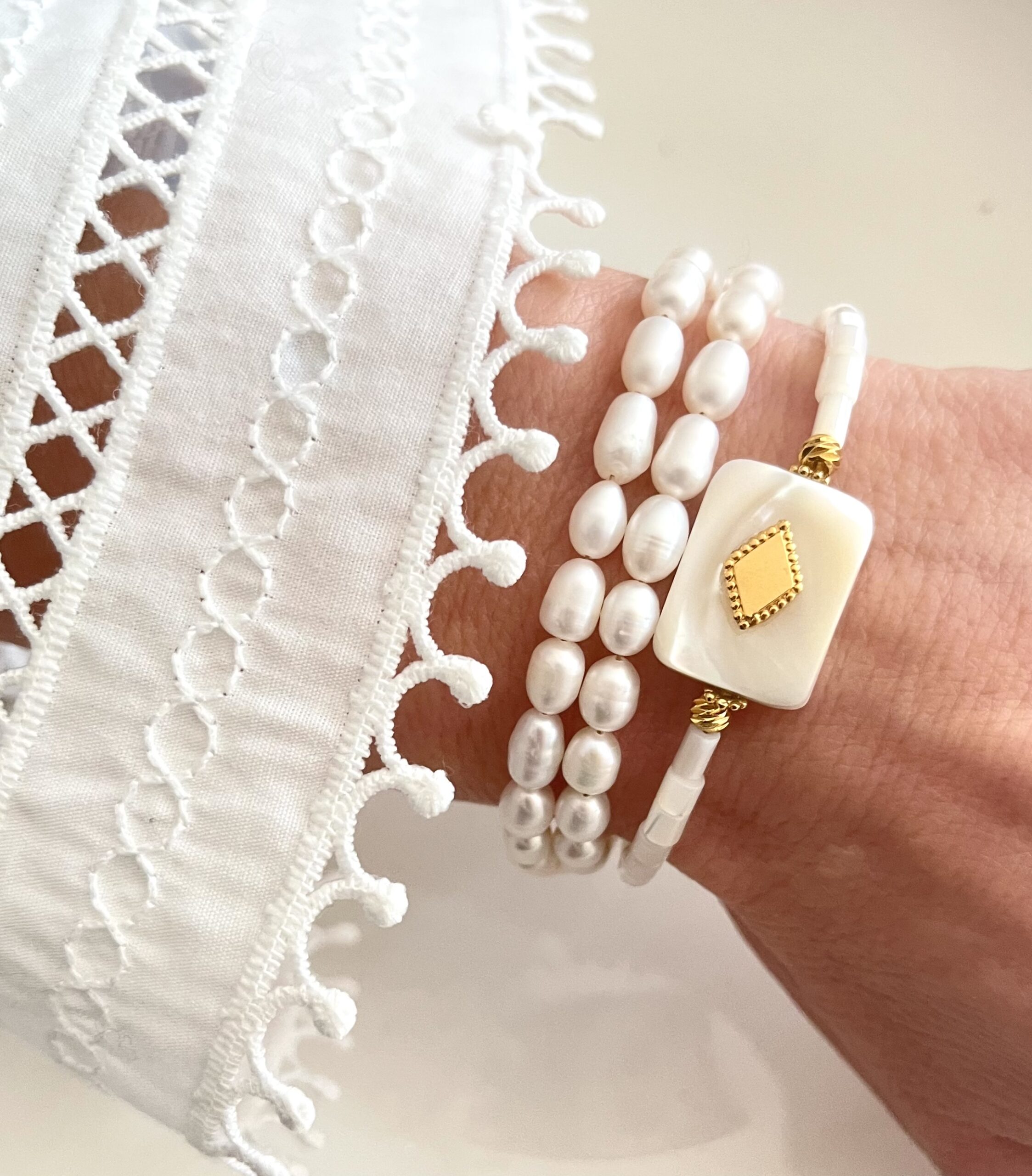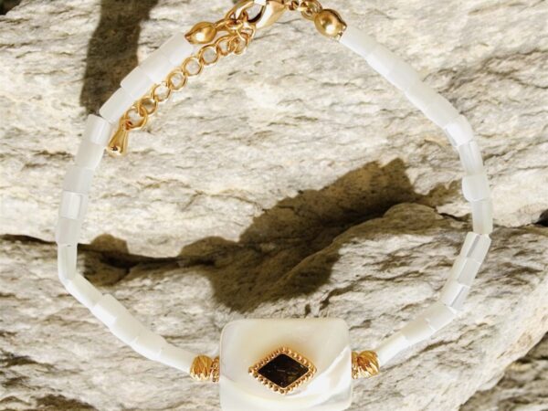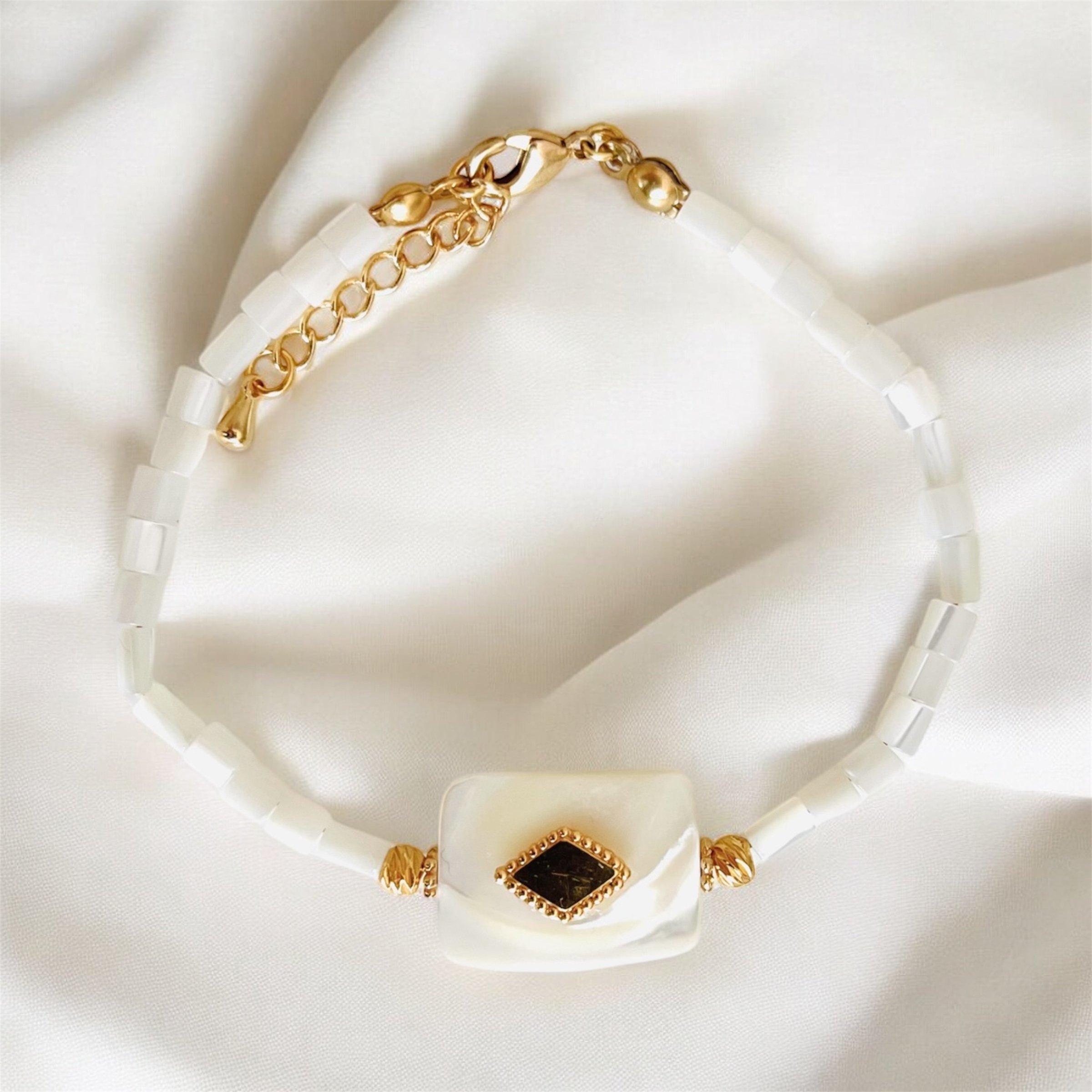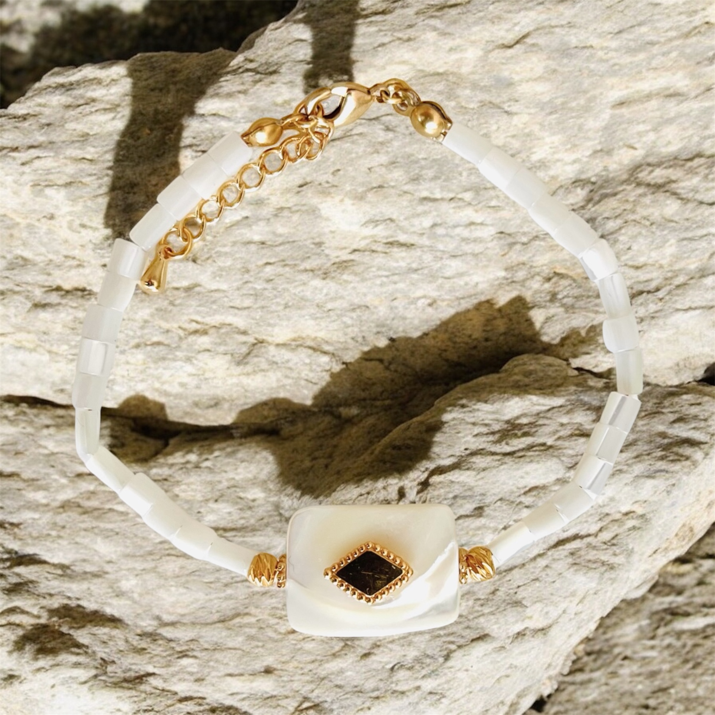 Bracelet femme mis en valeur par une délicate perle rectangulaire en nacre naturelle.