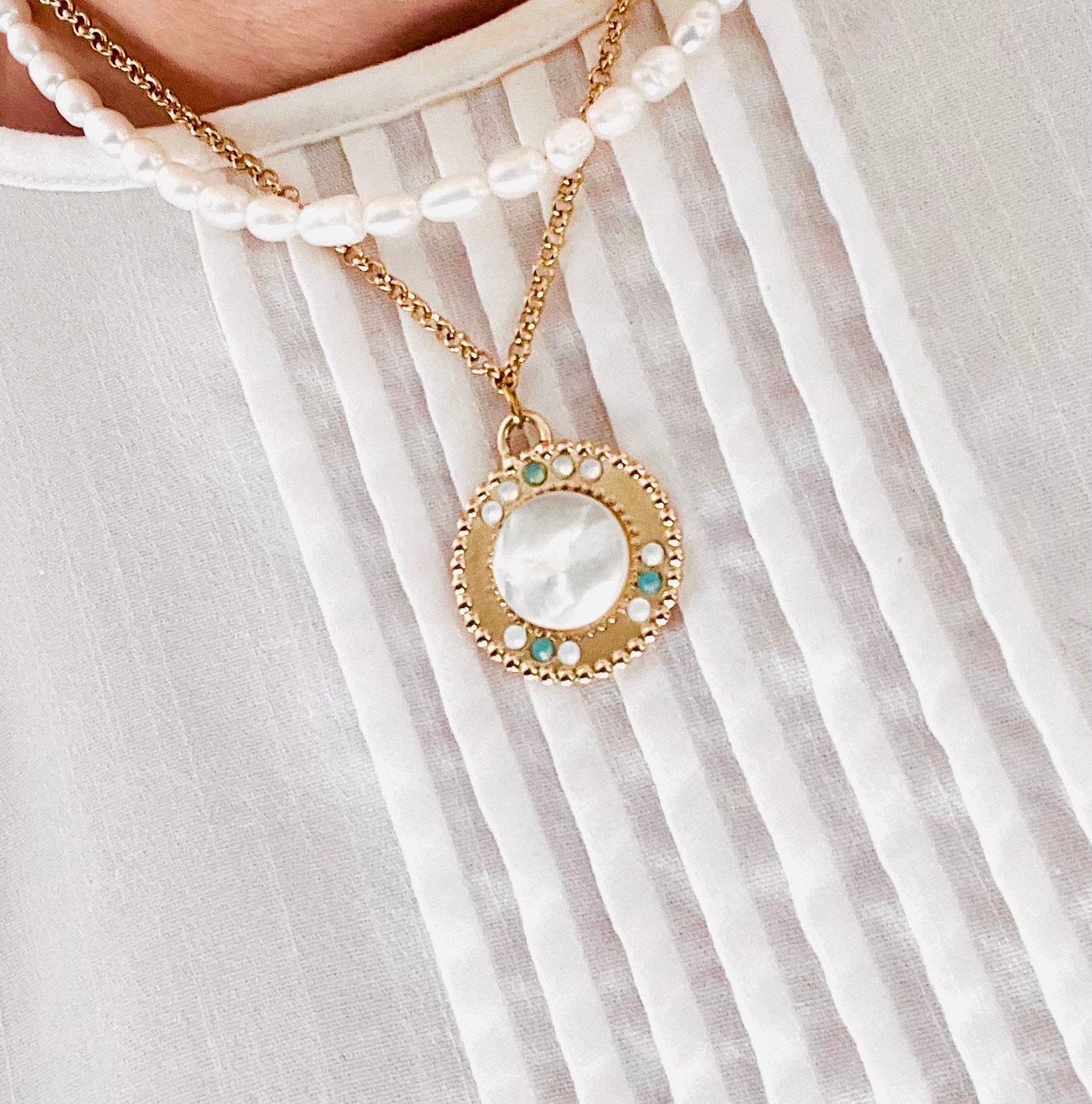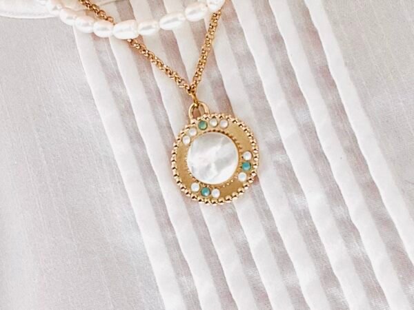 Au centre, une magnifique pierre ronde en nacre naturelle apporte une touche de douceur et de sophistication.