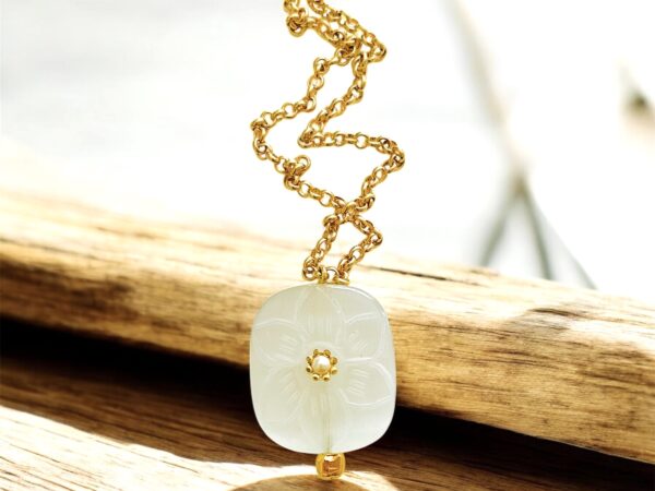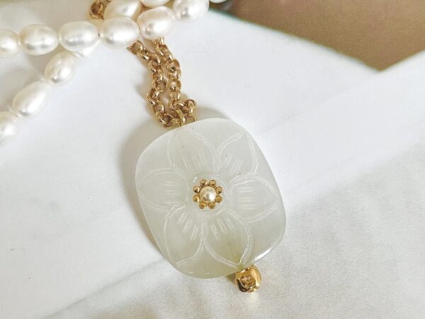 Bijou mis en valeur par un pendentif floral sculpté, surmontée d’une délicate perle nacrée en son centre.