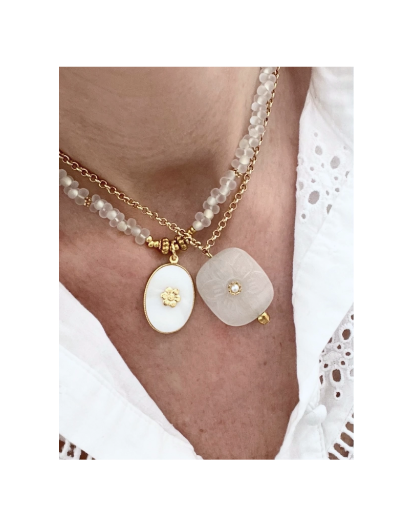 Au centre de cette fleur, une délicate perle nacrée ajoute une nuance subtile et romantique à notre collier pendentif.