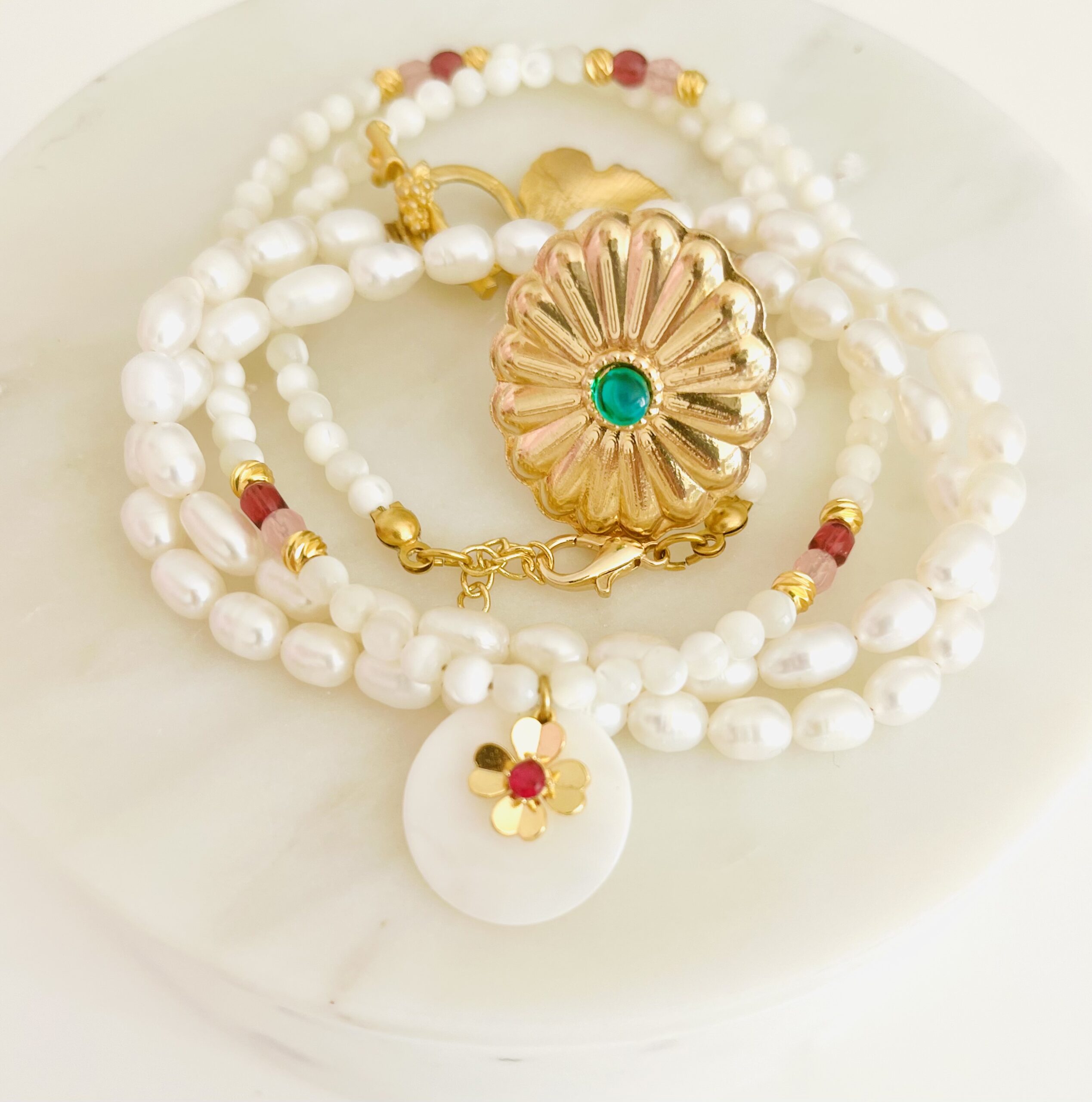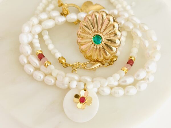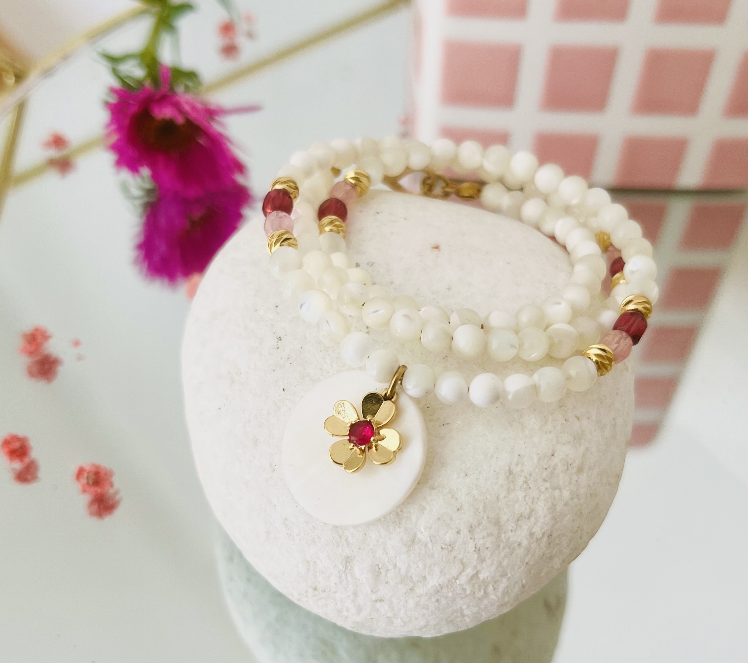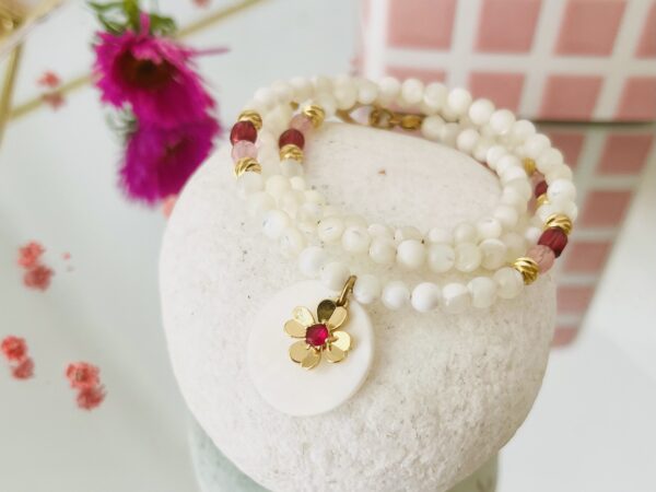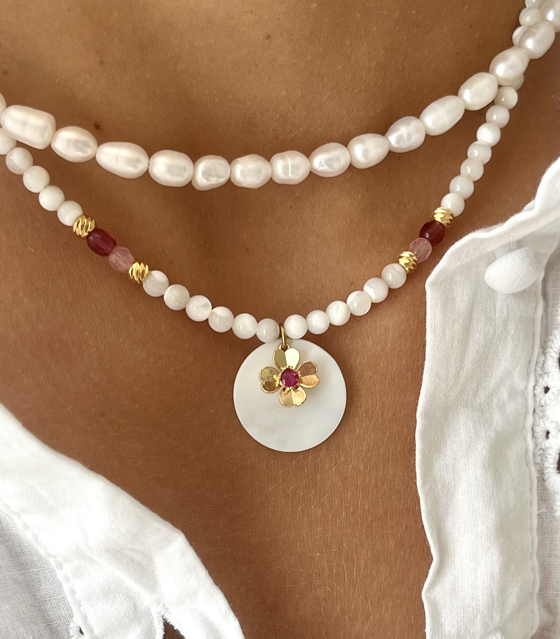 La chaîne du collier est composée de perles en nacre éclatantes, harmonieusement agrémentées de perles dark pink, créant un contraste chic. Les perles sont délicatement reliées par des perles dorés à or fin, apportant une touche de luxe à cette pièce.