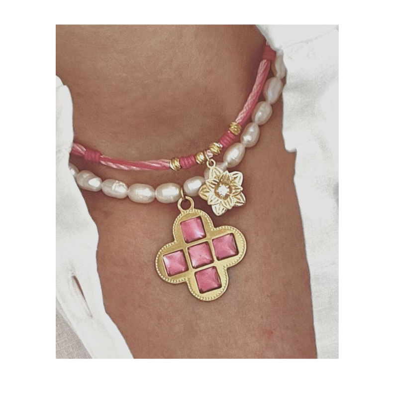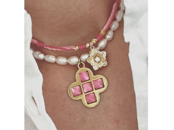 Bijou mis en valeur par un élégant fil de perles en nacre, apportant une douceur et une sophistication intemporelles à votre tenue.